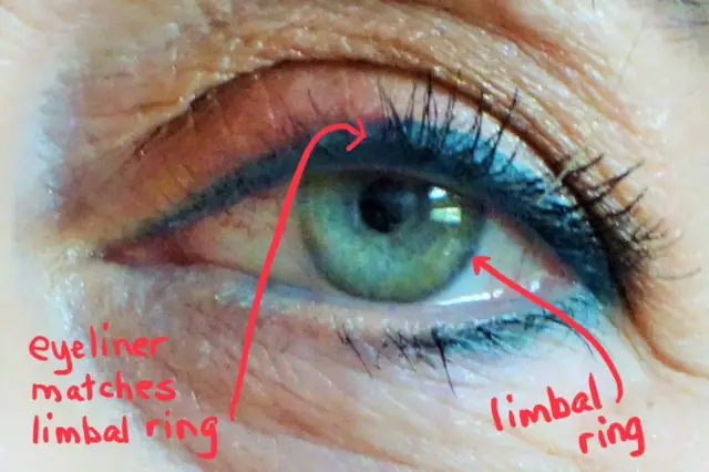 When you are over 60, your limbal ring is less noticeable and less defined than it was when you were 20, 30, or 40. Obviously, you can’t do anything to the eye itself to change the definition of your limbal ring (although you can give the illusion of it with contact lenses, some of which are tinted and designed to add definition to the limbal ring). But there is an easy way to bring out your eyes using makeup—you simply match your eyeliner to your limbal ring.