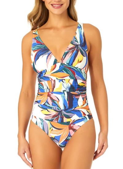 This stunning one-piece swimsuit pairs a colorful pattern with ruching at the waist to minimize. Find it at Anne Cole.